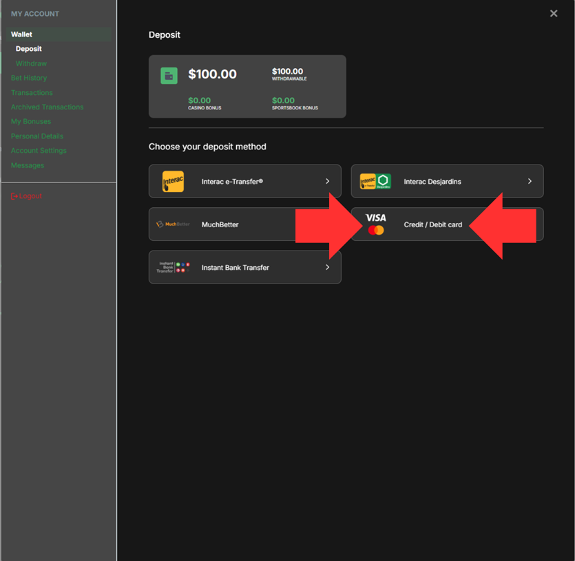 - Under Choose your deposit method, select Credit / Debit Card