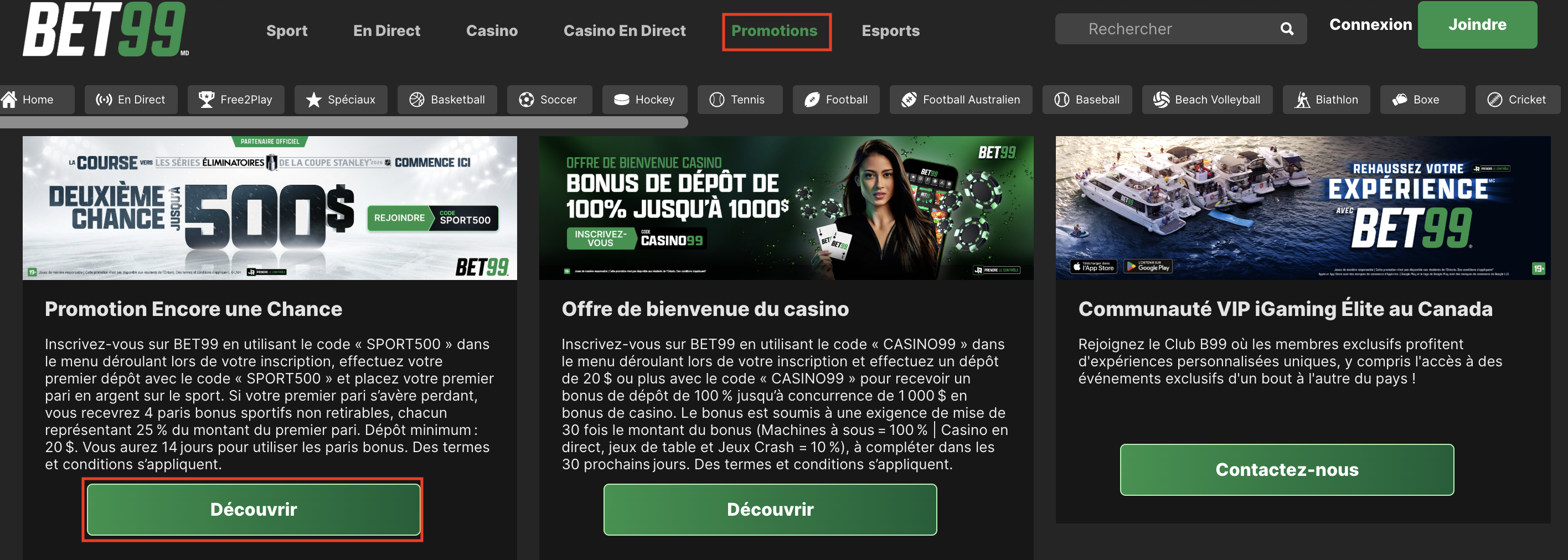 - Vous pouvez trouver toutes nos Promotions sous https://on.bet99.ca/fr/promotions