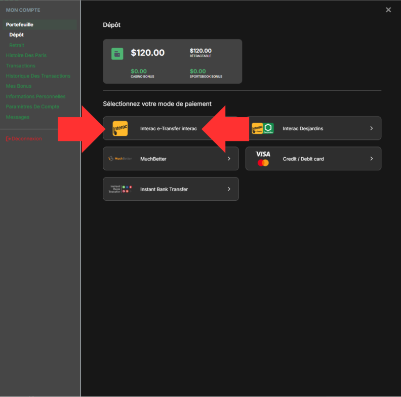 - Sous Choose your deposit method, sélectionnez Interac e-Transfer.