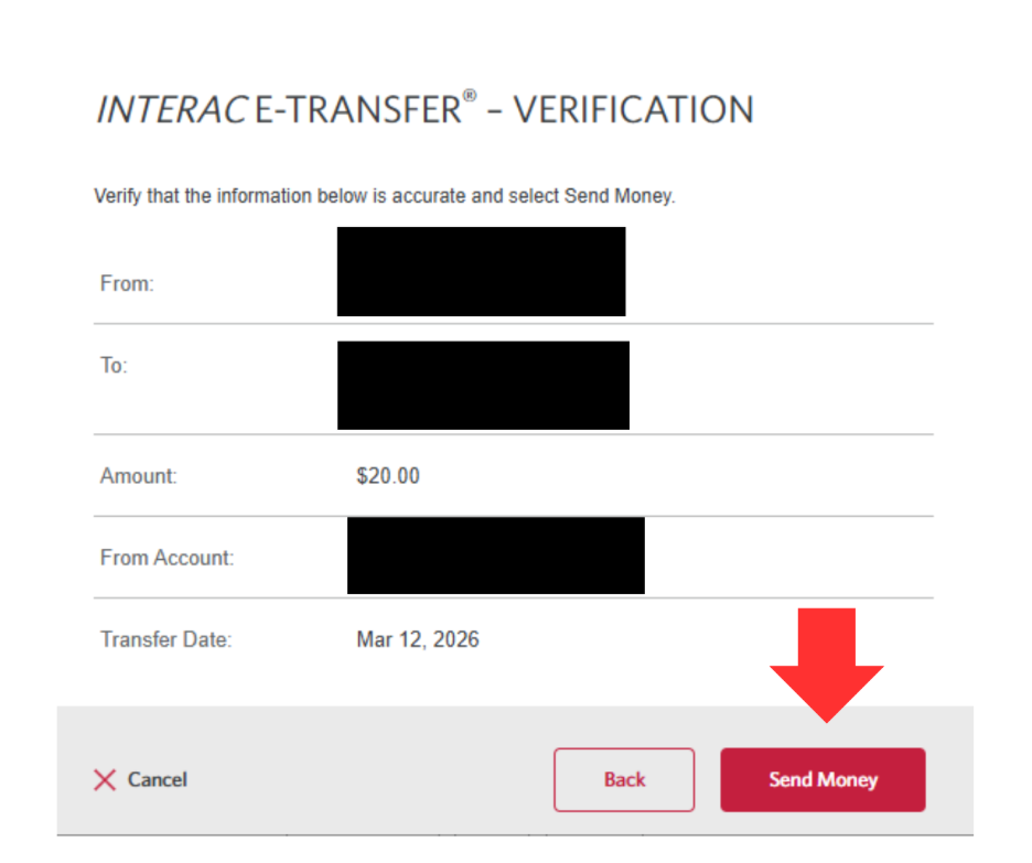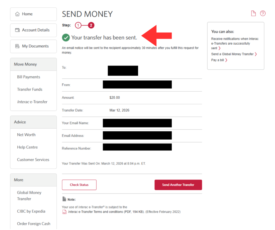 Votre banque affichera un écran de confirmation une fois que le transfert aura été complété avec succès.