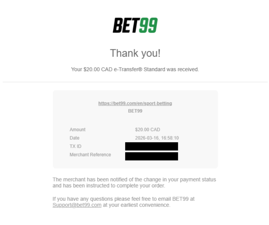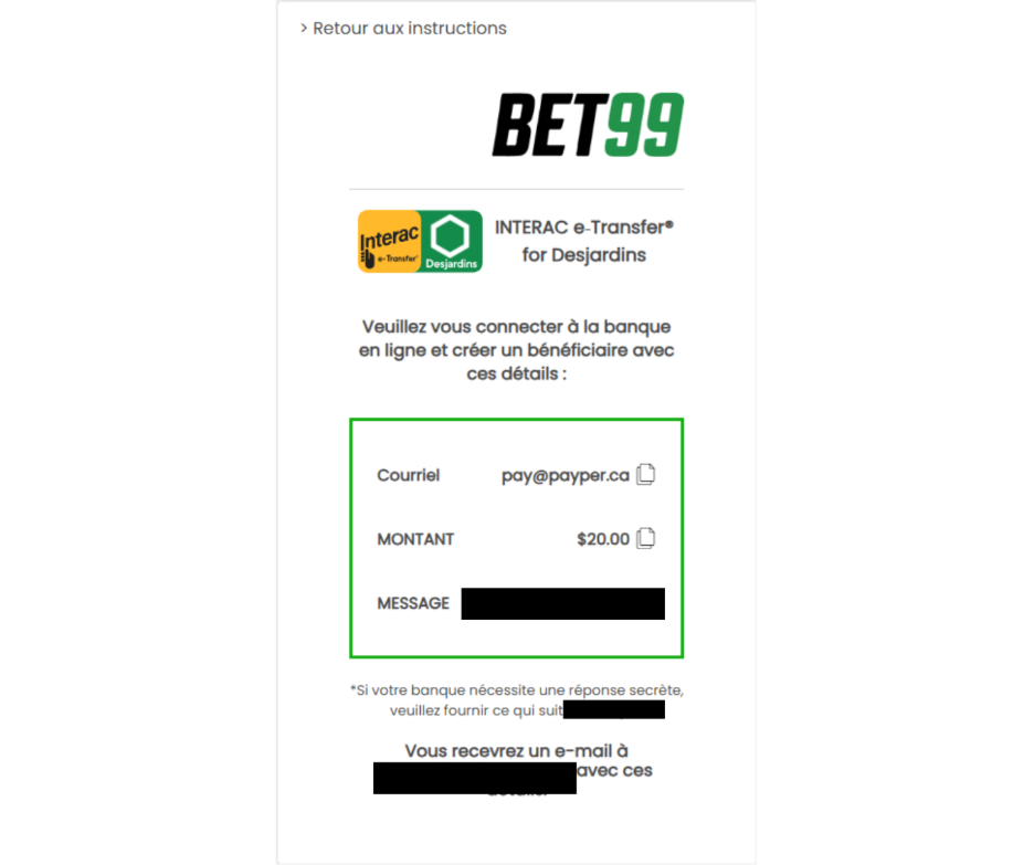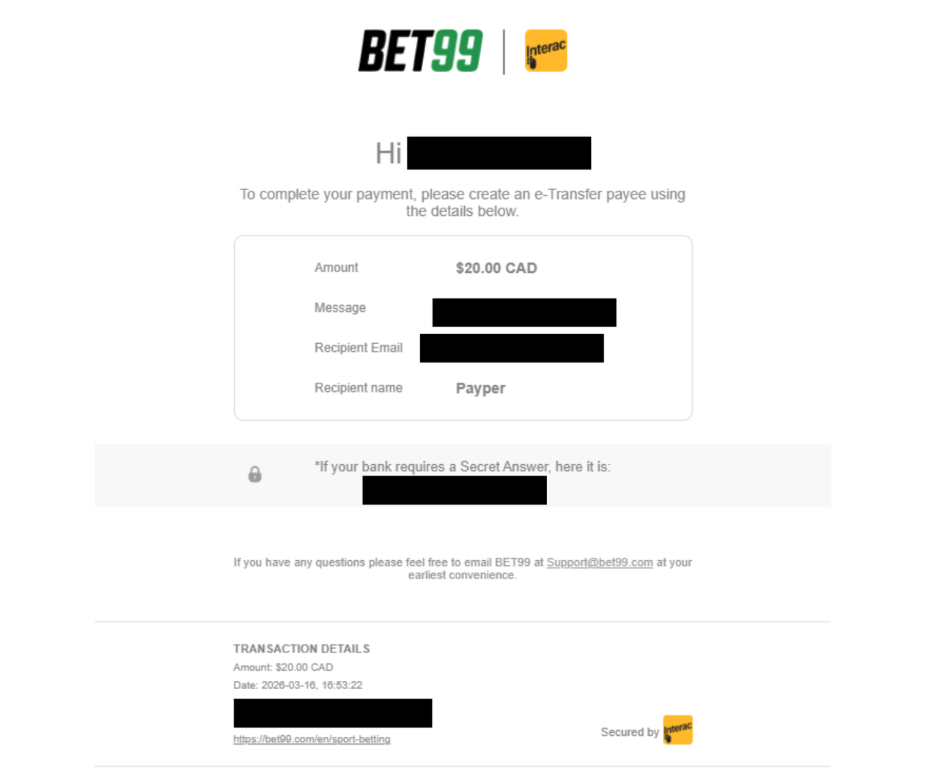 Vous pouvez approvisionner votre compte BET99 en utilisant le flux standard Interac e-Transfer.