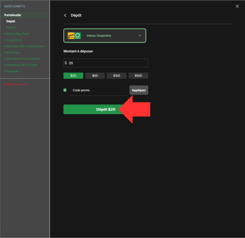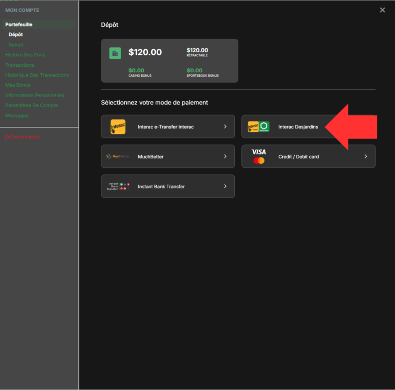 Sous Choisissez votre méthode de dépôt, sélectionnez Interac Desjardins.