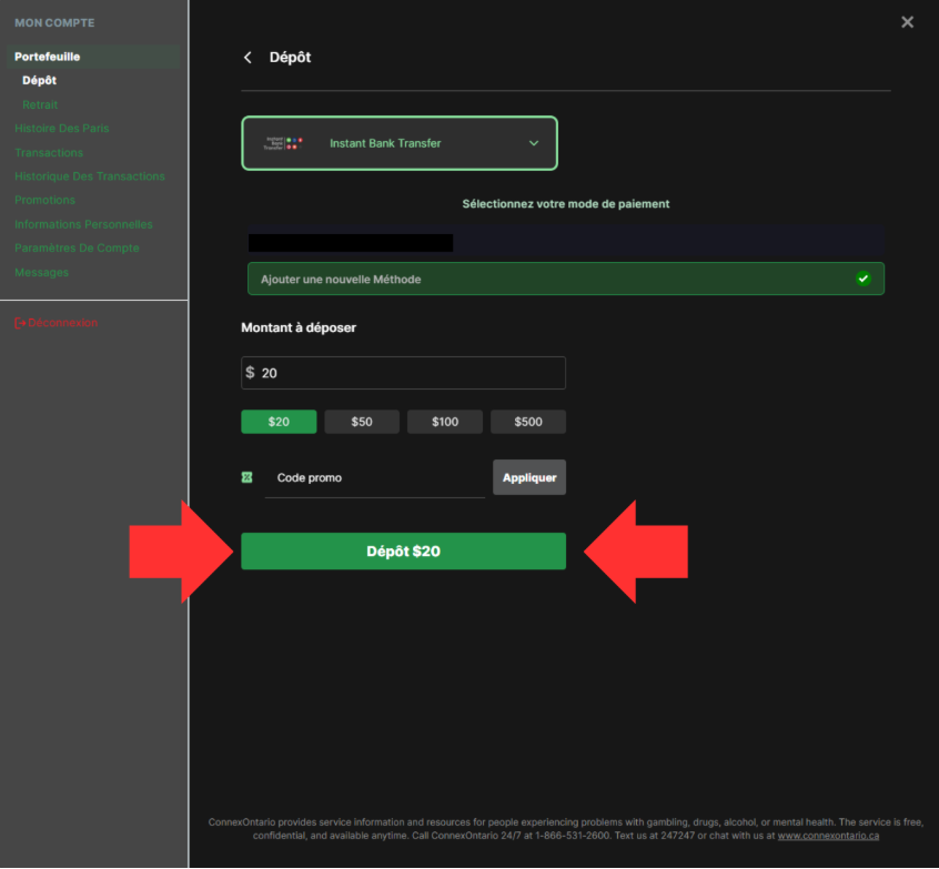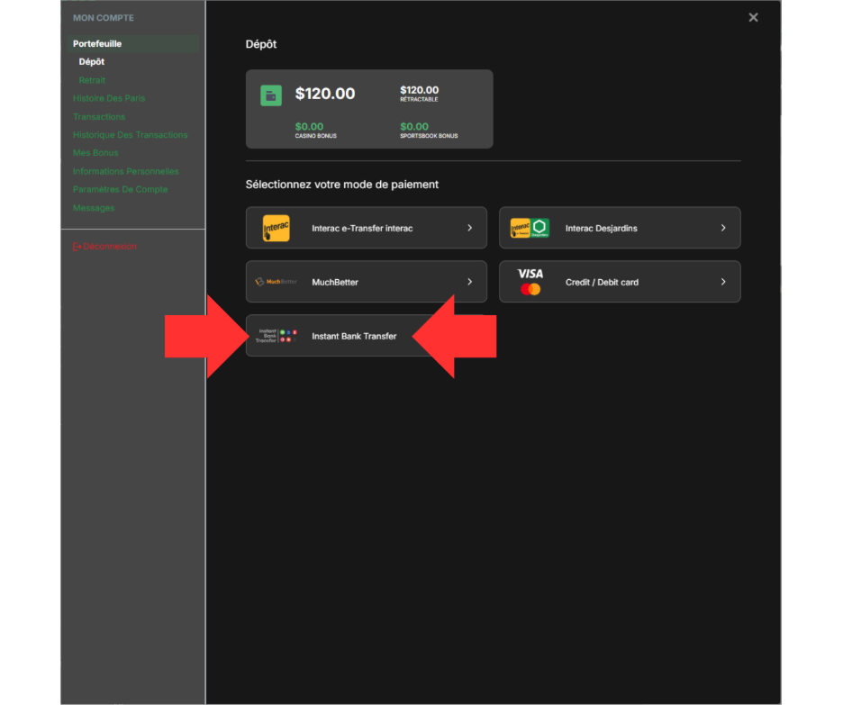 - Sous Choose your deposit method, sélectionnez Instant Bank Transfer.